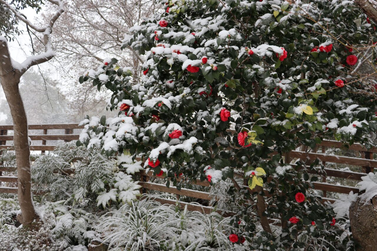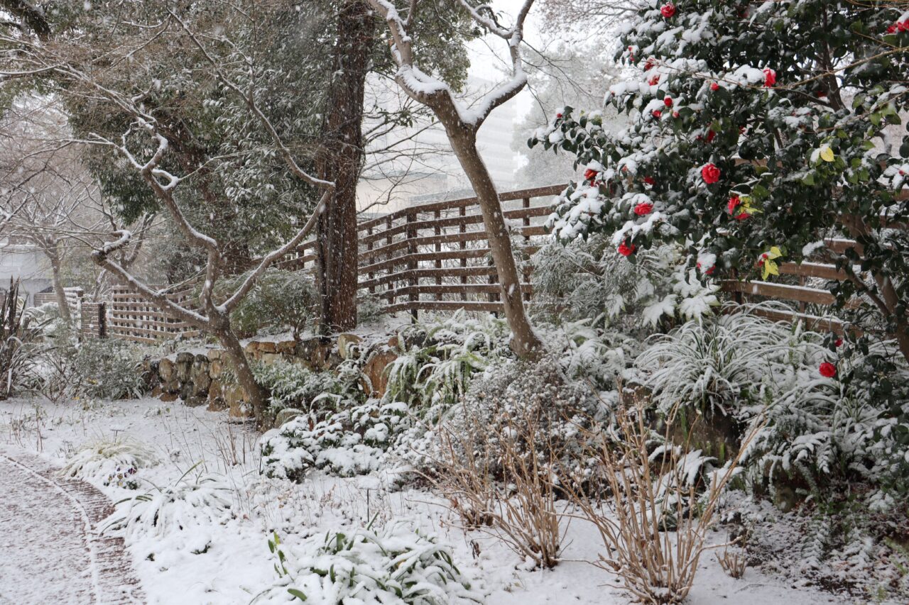 **庭園・メインガーデンの植物情報【2月】** 8日に雪が積もりました