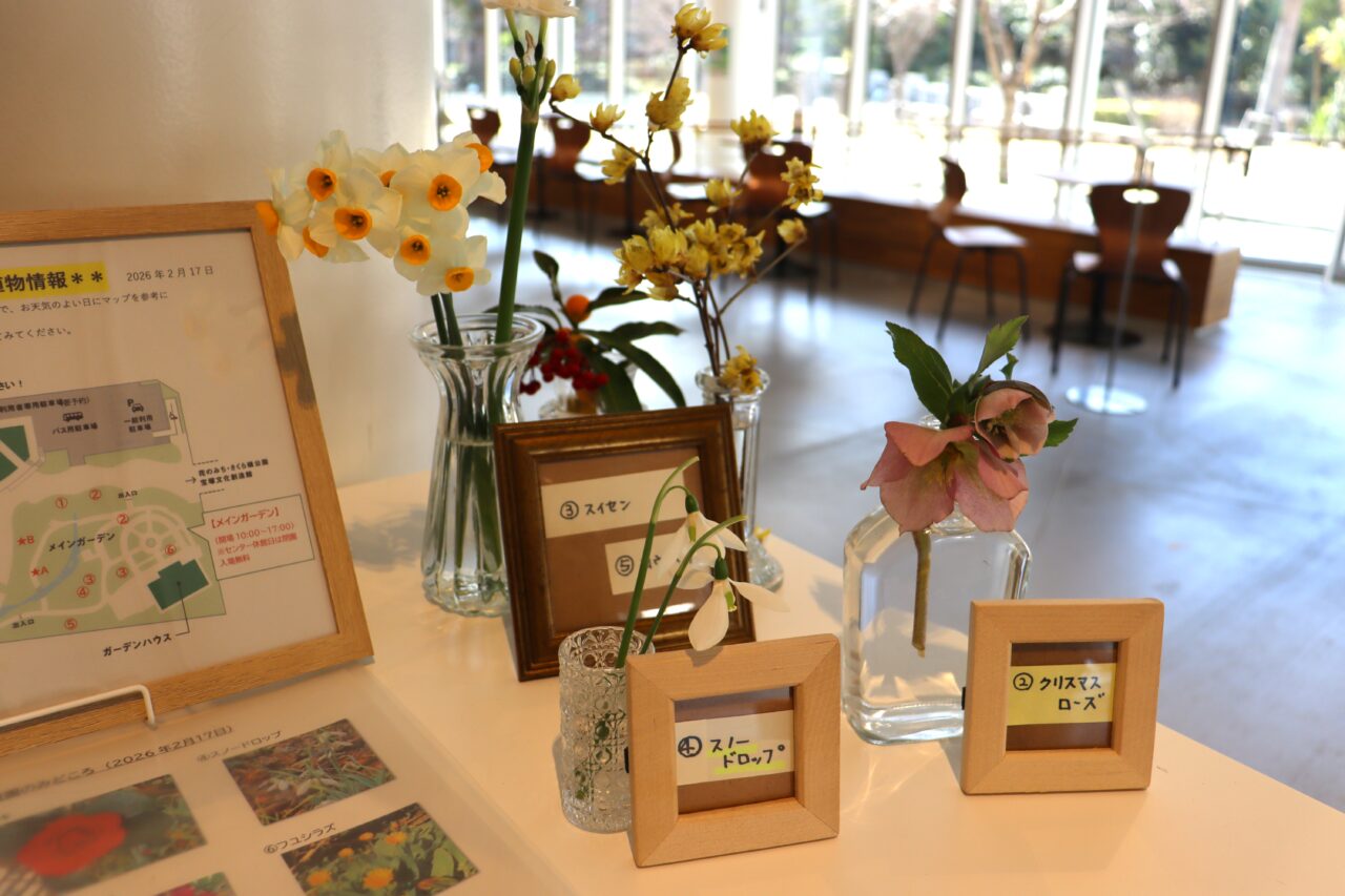 なお、文化芸術センターの1階ホワイエに、庭園で咲いているお花を展示しています。1階にはセレクトショップと喫茶もありますよ。